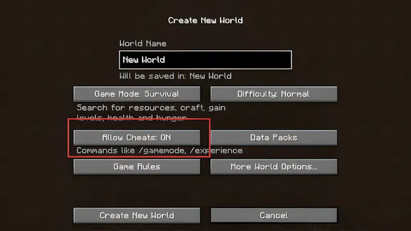 Để sử dụng được các lệnh trong Minecraft, điều kiện tiên quyết là bạn phải bật Chức năng Lệnh (Cheats) trong thế giới của mình. Nếu bạn đang tạo thế giới mới, hãy đảm bảo đã bật tùy chọn này. Còn nếu bạn đang chơi một thế giới đã có, bạn có thể mở Menu (Esc) -> Mở trong LAN -> Cho phép Gian lận: BẬT, sau đó chọn “Bắt đầu thế giới LAN”.